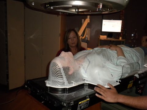 I hate the waiting room, but thankfully I rarely have to be there long before I’m told to go change into my gown. After I get my gown on, I’m strapped (actually bolted) to the table by the form they made of my head and chest to hold me into place. Behind my neck, they place a hard plastic neck roll that thrusts my neck out and my head back. The first time they put the form on me I felt like someone was strangling me. I went into panic mode because I couldn’t breathe, swallow or talk. I started moaning and flapping my arms frantically and they quickly removed it. I gasped for air and told them the neck part cut off my ability to breath. They made a very minor adjustment and bolted me back in. It is still extremely painful to swallow and talk, but I just lay there and try my best to meditate and listen to my music. If you lay your hand on your neck and swallow, you can feel your neck pulse out a bit. Imagine lying down and having a weight placed on that spot applying constant pressure. That’s what it’s like for the duration of my therapy. Thankfully it only lasts about 5-6 minutes total, but I still hate it. The first day I was bolted in for an hour as they took x-rays. I will have to have the 45 minute to 1 hour sessions once a week to check on the tumors to make sure they’re shrinking.